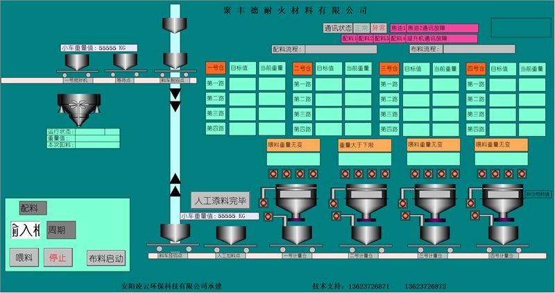 本公司擁有優良的生產設備和技術開發團隊,以良好的管理模式,豐富的生產和設計經驗為環保工作做出了的一定的貢獻。主要針對鋼鐵、耐材等行業無塵環保配料工藝的改進,設計和生產全自動化無塵配料設備。除塵部分分為:集中式收塵和分散式收塵。計量部分分為:增量計量和減量計量控制模式。控制部分分為:純單片機控制、單片機加PLC控制、純PLC控制。